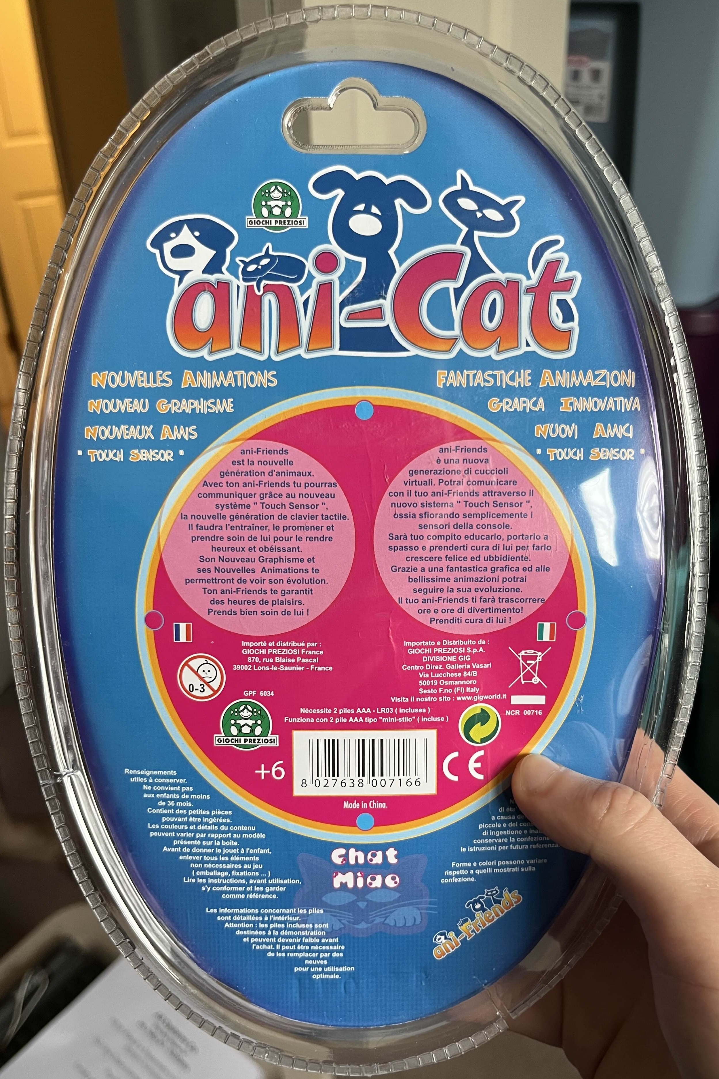 Note 1: Giochi Preziosi/GiG Ani-{pet}/AniPod have very similar packaging. The font is more yellow on the "dash" variants. They all have the Giochi Preziosi logo. GiG was acquired during the year these were distributed. They were distributed in France under Giochi Preziosi. In Italy, under GiG. This website covering GiG toys covered the AniPod. I think you could get either name variant in either country depending on when you bought it. It's a whole damn mess.